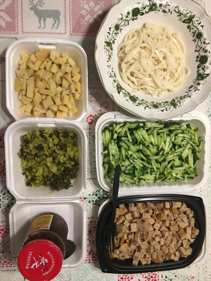 除夕夜,美食節目上,「視吃」白胖可愛的餃子。今天中午,以冰箱裡現有的食材:酸菜、竹筍、素香菇捲為料,試做炸醬麵。我將酸菜切碎碎,竹筍、香菇卷切丁,清香的黃瓜切絲,拌以特製的辣椒醬。成就了一簡易版的,變調的另類炸醬麵。和外子二人,大快朵頤!也藉以慰我濃濃的思–親–深–情⋯⋯⋯