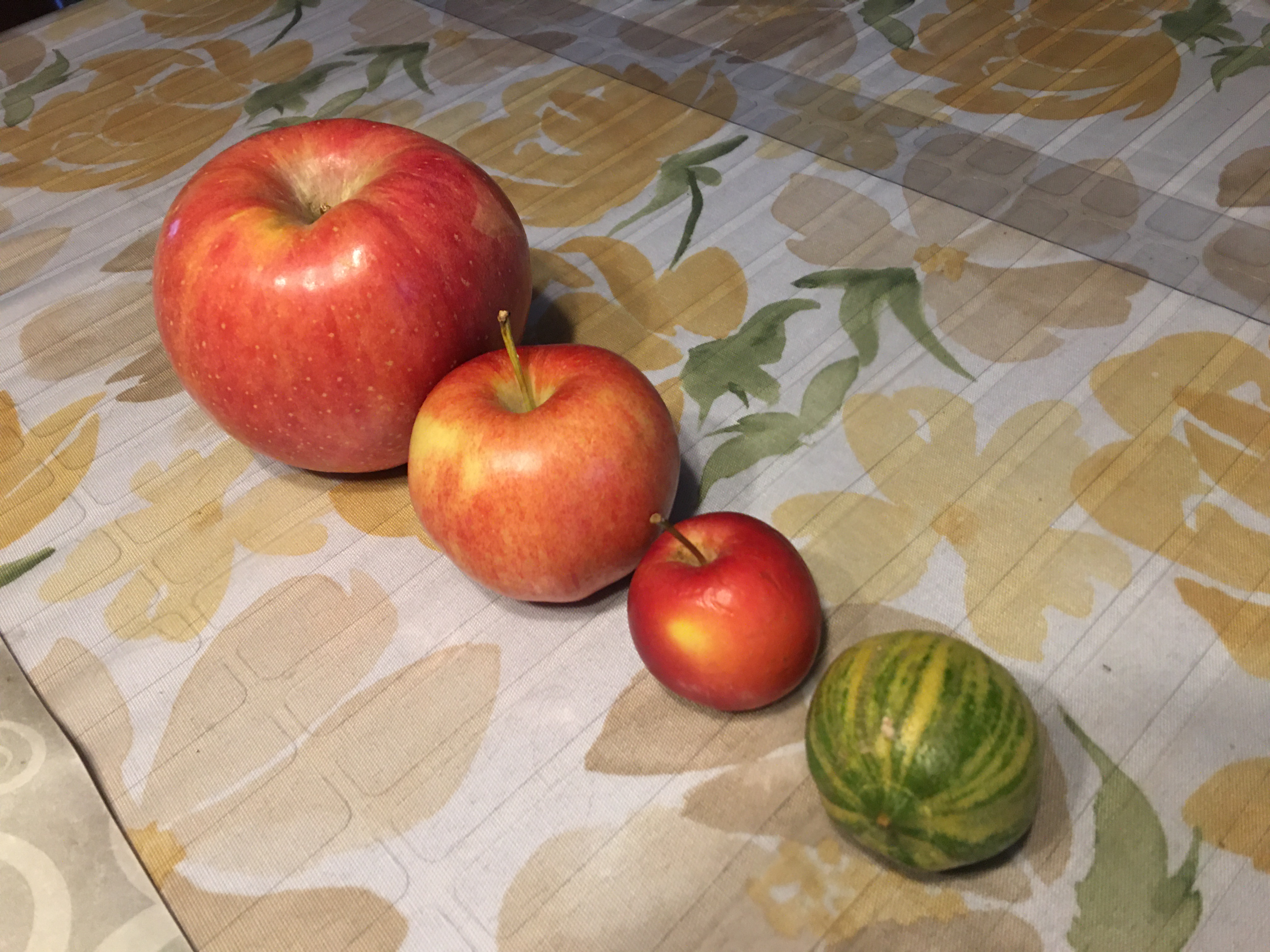 在上面第二張照片,其中綠色的一顆,我和外子二人,左看右看,看了半天也看不出是什麼,只是覺得很稀奇、有趣。一問之下,方知是這對姊妹家栽的檸檬,不酸,而且是甜的。甜檸檬?這還真不曾聽過。加上也是從她們得到的、不曾見過的、迷你小蘋果。吁!真是太可愛啦!回到家,忍不住將特大號蘋果、一般蘋果、迷你蘋果,以及不酸的甜檸檬,排排坐在一起,捨不得吃,照相下來,當藝術品玩賞,煞是有趣!