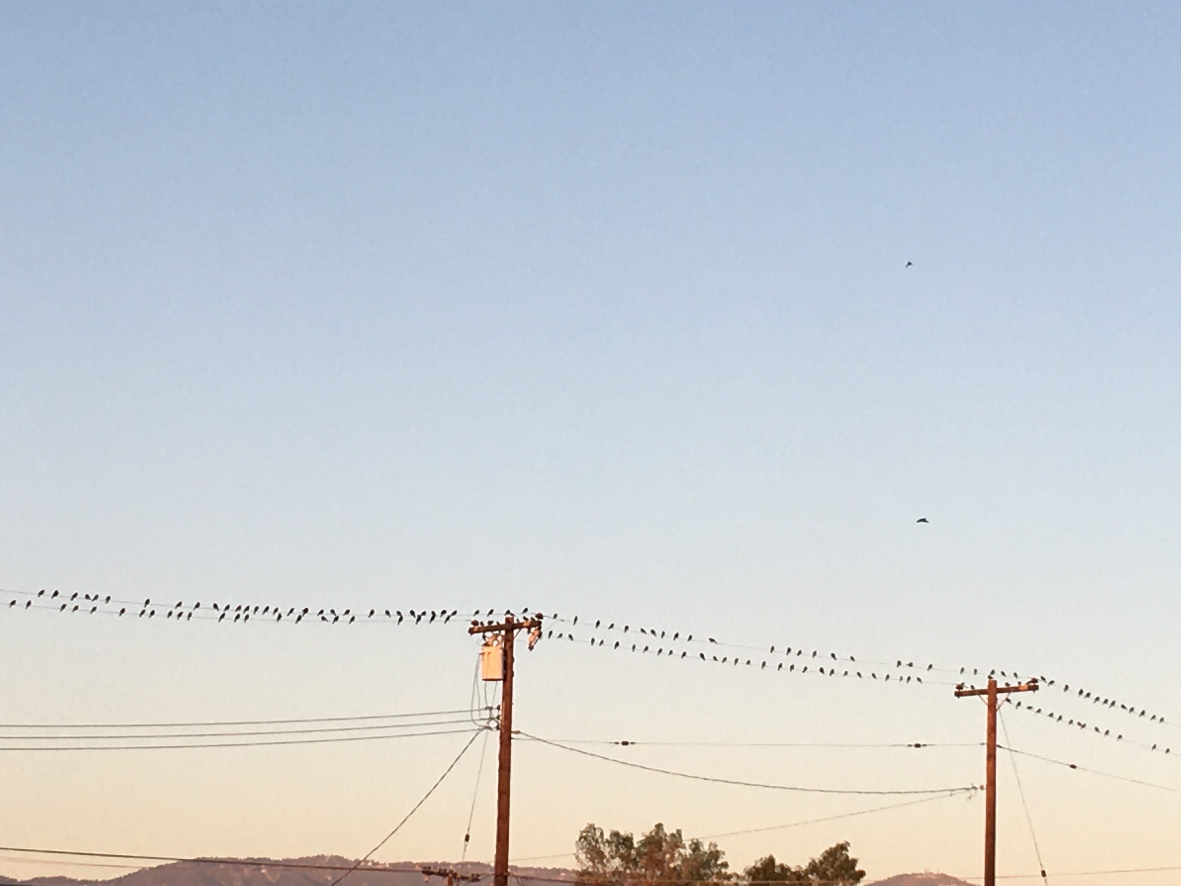 向晚時分,驚見對面電纜線上,停滿整排小鳥