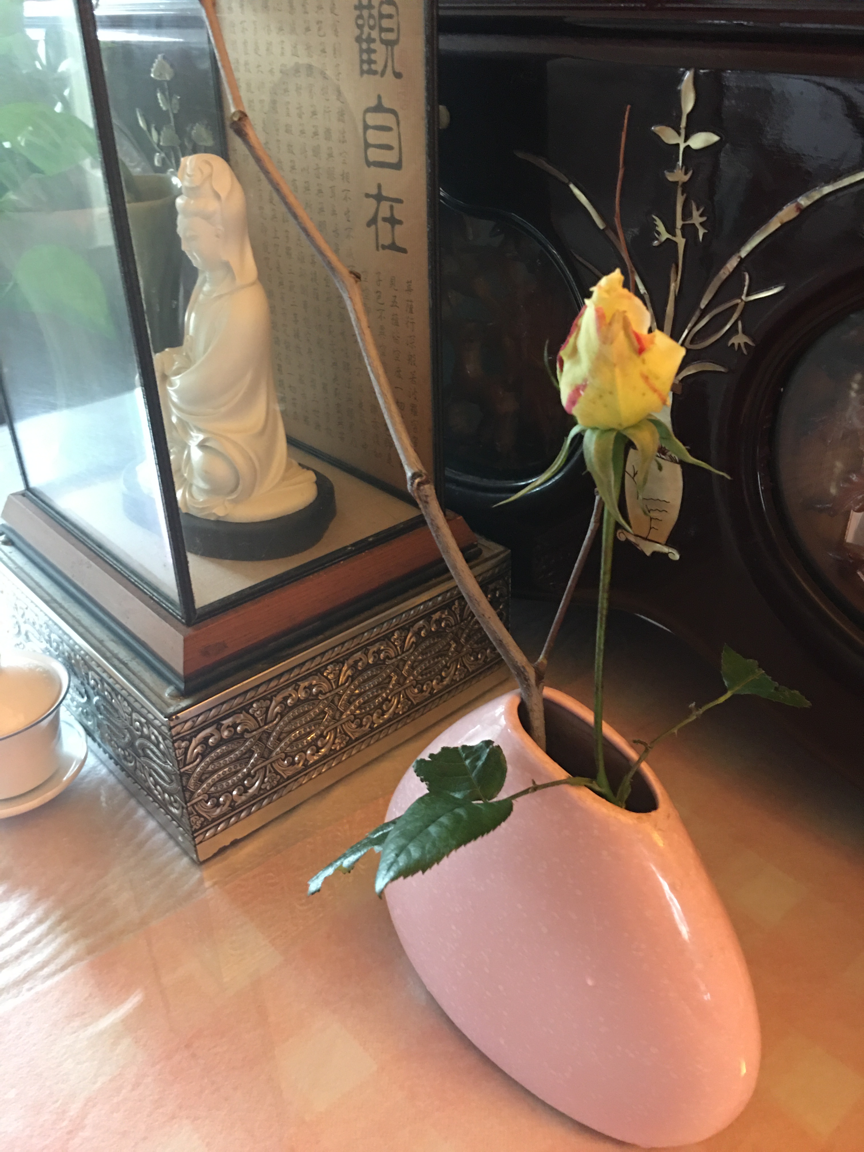 我虔誠的雙手捧著木杯,先慢慢慢慢聞著茶香,再慢慢慢慢含在口裡,之後慢慢慢慢滑入喉。頓覺神清氣爽,滌去塵思俗慮不少。在衆多茶具中,有一方深褐色長型、上面刻有龜紋,猶如皇帝玉璽之物,捉住了我的眼神。握在手中,有些重量,忙問王兄是何物?他說那是限量版的朱砂蓋置,置放杯蓋用。又注意到杯蓋繫有精緻的中國結。王兄說是特別請師傅編製的,一方面是為了杯蓋不會滑落,一方面壺裡的熱茶不會燙到手。